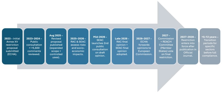 On 27 August 2025, ECHA confirmed it will consult on a draft SEAC opinion in spring 2026, with final opinions expected by the end of 2026 (ECHA, 2025c). After that, the European Commission and Member States will decide on the restriction.