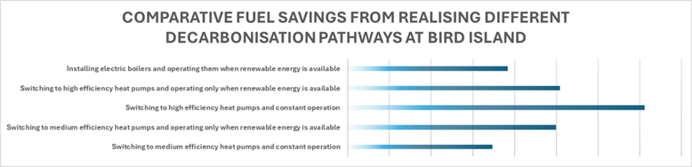 - The fuel reduction potential of renewable energy expansion alongside installing building fabric improvements, electric boilers and heat pumps, procuring electric vehicles and connecting isolated buildings to the common grid. Our findings suggest that the percentage of renewable energy on the grid could be increased by 70% at Bird Island and by 10% at King Edward Point from the addition of heat pumps/boilers and renewable energy capacity.