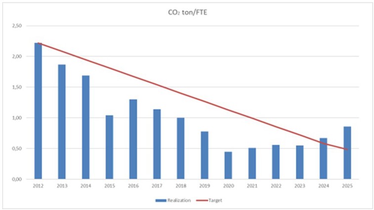 De onderstaande grafiek toont vanaf het startjaar 2012 tot en met heden de CO₂-uitstoot ton per FTE en de bijbehorende doelstellingen.